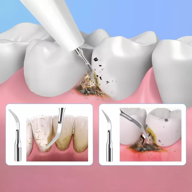 Our ultrasonic scaler lights up dark areas so you can see stains and plaque clearly. This makes every session more effective and thorough.